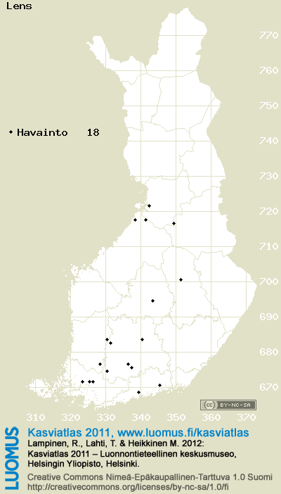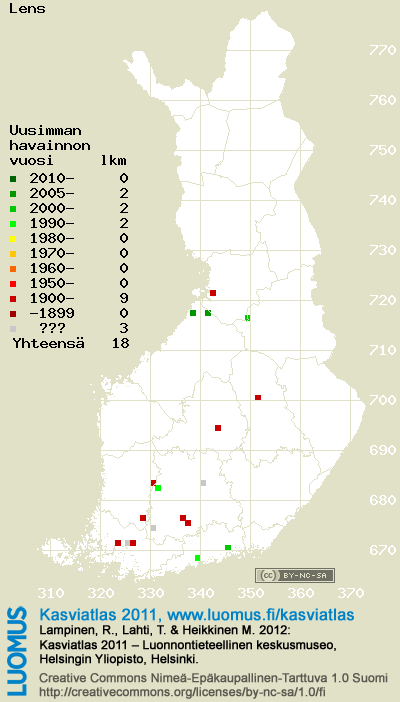 Tämä on vuoden 2011 kasviatlaksen karttasivu taksonista Lens. Tästä taksonista voi olla karttoja myös muissa atlaksen vuosiversioissa: 2018 / 2017 / 2016 / 2015 / 2014 / 2013 / 2012 / 2011 / 2010 / 2009 / 2008 / 2007 / 2006.