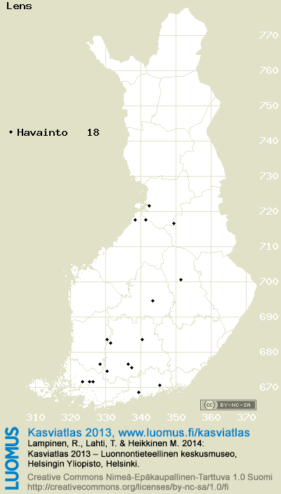 Tämä on vuoden 2013 kasviatlaksen karttasivu taksonista Lens. Tästä taksonista voi olla karttoja myös muissa atlaksen vuosiversioissa: 2018 / 2017 / 2016 / 2015 / 2014 / 2013 / 2012 / 2011 / 2010 / 2009 / 2008 / 2007 / 2006.