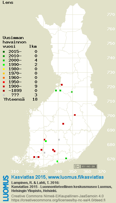 Tämä on vuoden 2015 kasviatlaksen karttasivu taksonista Lens. Tästä taksonista voi olla karttoja myös muissa atlaksen vuosiversioissa: 2018 / 2017 / 2016 / 2015 / 2014 / 2013 / 2012 / 2011 / 2010 / 2009 / 2008 / 2007 / 2006.