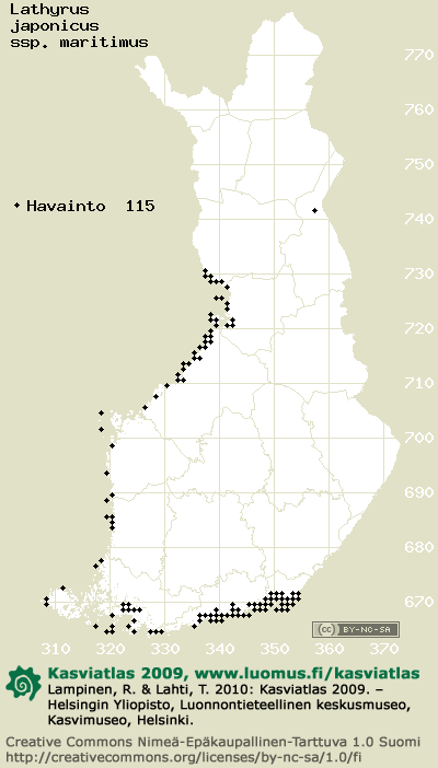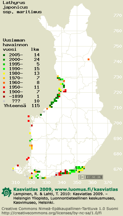 Tämä on vuoden 2009 kasviatlaksen karttasivu taksonista Lathyrus japonicus ssp. maritimus. Tästä taksonista voi olla karttoja myös muissa atlaksen vuosiversioissa: 2018 / 2017 / 2016 / 2015 / 2014 / 2013 / 2012 / 2011 / 2010 / 2009 / 2008 / 2007 / 2006.