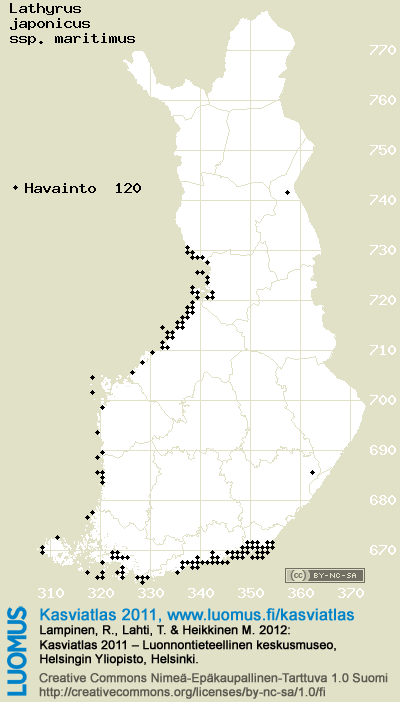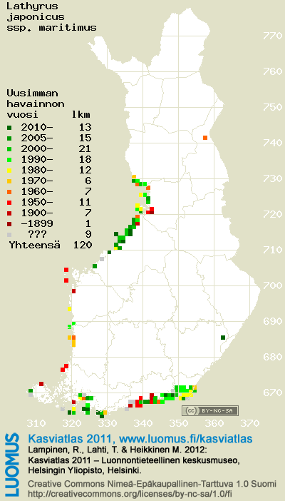 Tämä on vuoden 2011 kasviatlaksen karttasivu taksonista Lathyrus japonicus ssp. maritimus. Tästä taksonista voi olla karttoja myös muissa atlaksen vuosiversioissa: 2018 / 2017 / 2016 / 2015 / 2014 / 2013 / 2012 / 2011 / 2010 / 2009 / 2008 / 2007 / 2006.