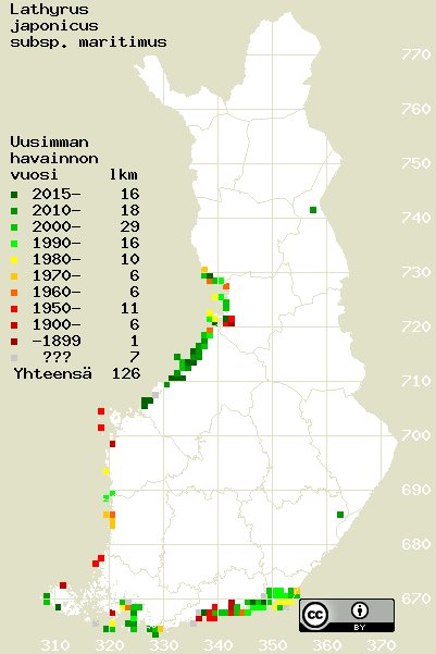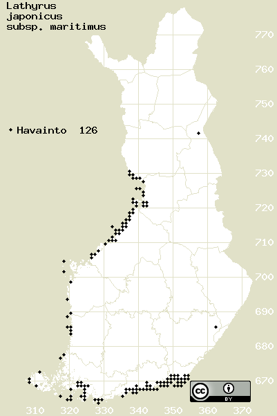 Tämä on vuoden 2016 kasviatlaksen karttasivu taksonista Lathyrus japonicus subsp. maritimus. Tästä taksonista voi olla karttoja myös muissa atlaksen vuosiversioissa: 2018 / 2017 / 2016 / 2015 / 2014 / 2013 / 2012 / 2011 / 2010 / 2009 / 2008 / 2007 / 2006.