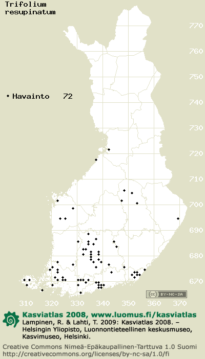 Tämä on vuoden 2008 kasviatlaksen karttasivu taksonista Trifolium resupinatum. Tästä taksonista voi olla karttoja myös muissa atlaksen vuosiversioissa: 2018 / 2017 / 2016 / 2015 / 2014 / 2013 / 2012 / 2011 / 2010 / 2009 / 2008 / 2007 / 2006.