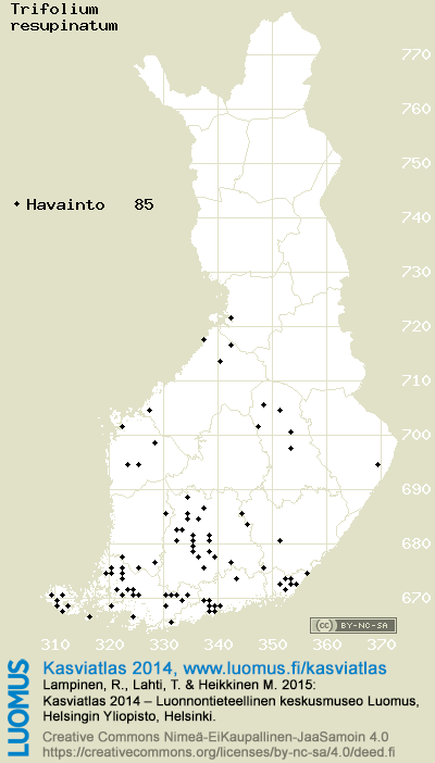 Tämä on vuoden 2014 kasviatlaksen karttasivu taksonista Trifolium resupinatum. Tästä taksonista voi olla karttoja myös muissa atlaksen vuosiversioissa: 2018 / 2017 / 2016 / 2015 / 2014 / 2013 / 2012 / 2011 / 2010 / 2009 / 2008 / 2007 / 2006.