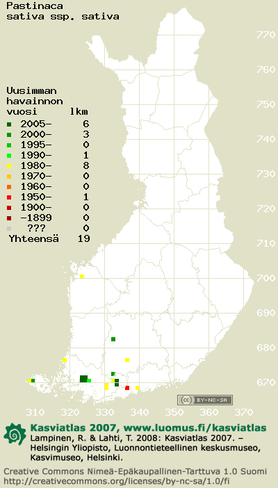 Tämä on vuoden 2007 kasviatlaksen karttasivu taksonista Pastinaca sativa ssp. sativa. Tästä taksonista voi olla karttoja myös muissa atlaksen vuosiversioissa: 2018 / 2017 / 2016 / 2015 / 2014 / 2013 / 2012 / 2011 / 2010 / 2009 / 2008 / 2007 / 2006.
