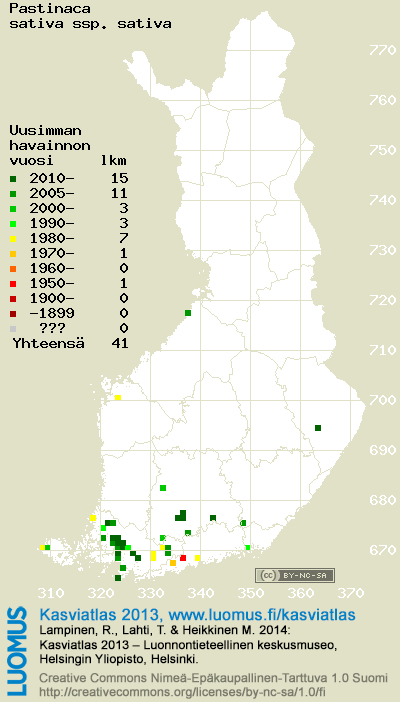 Tämä on vuoden 2013 kasviatlaksen karttasivu taksonista Pastinaca sativa ssp. sativa. Tästä taksonista voi olla karttoja myös muissa atlaksen vuosiversioissa: 2018 / 2017 / 2016 / 2015 / 2014 / 2013 / 2012 / 2011 / 2010 / 2009 / 2008 / 2007 / 2006.