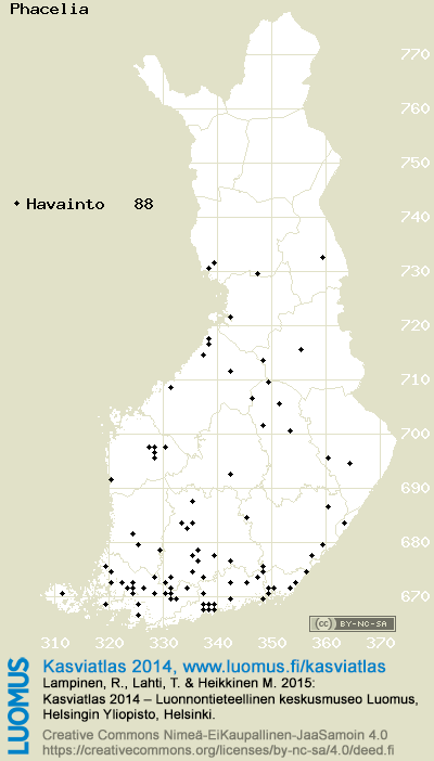Tämä on vuoden 2014 kasviatlaksen karttasivu taksonista Phacelia. Tästä taksonista voi olla karttoja myös muissa atlaksen vuosiversioissa: 2018 / 2017 / 2016 / 2015 / 2014 / 2013 / 2012 / 2011 / 2010 / 2009 / 2008 / 2007 / 2006.