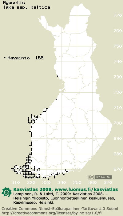 Tämä on vuoden 2008 kasviatlaksen karttasivu taksonista Myosotis laxa ssp. baltica. Tästä taksonista voi olla karttoja myös muissa atlaksen vuosiversioissa: 2018 / 2017 / 2016 / 2015 / 2014 / 2013 / 2012 / 2011 / 2010 / 2009 / 2008 / 2007 / 2006.