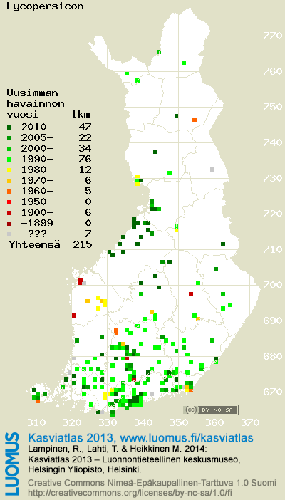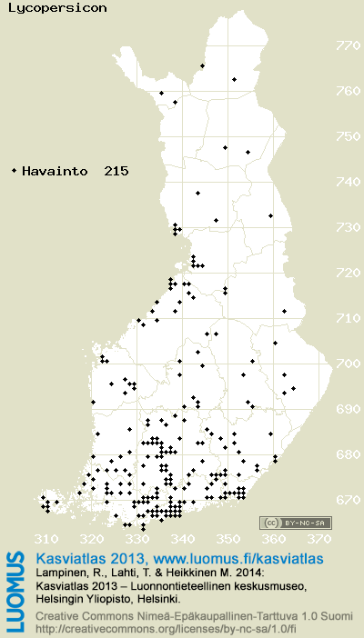 Tämä on vuoden 2013 kasviatlaksen karttasivu taksonista Lycopersicon. Tästä taksonista voi olla karttoja myös muissa atlaksen vuosiversioissa: 2018 / 2017 / 2016 / 2015 / 2014 / 2013 / 2012 / 2011 / 2010 / 2009 / 2008 / 2007 / 2006.
