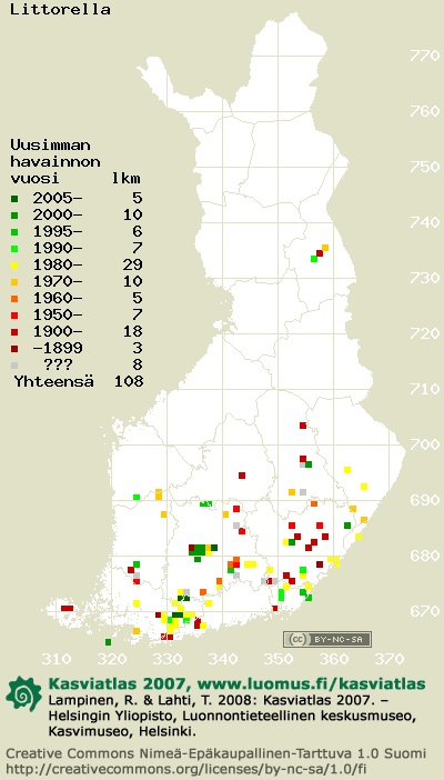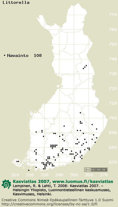 Tämä on vuoden 2006 kasviatlaksen karttasivu taksonista Littorella. Tästä taksonista voi olla karttoja myös muissa atlaksen vuosiversioissa: 2018 / 2017 / 2016 / 2015 / 2014 / 2013 / 2012 / 2011 / 2010 / 2009 / 2008 / 2007 / 2006.