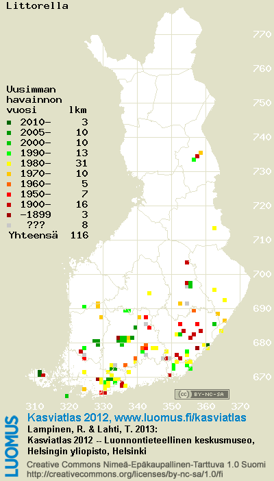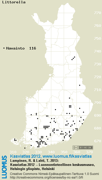 Tämä on vuoden 2012 kasviatlaksen karttasivu taksonista Littorella. Tästä taksonista voi olla karttoja myös muissa atlaksen vuosiversioissa: 2018 / 2017 / 2016 / 2015 / 2014 / 2013 / 2012 / 2011 / 2010 / 2009 / 2008 / 2007 / 2006.