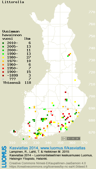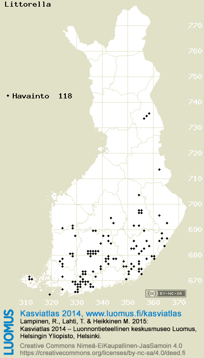 Tämä on vuoden 2014 kasviatlaksen karttasivu taksonista Littorella. Tästä taksonista voi olla karttoja myös muissa atlaksen vuosiversioissa: 2018 / 2017 / 2016 / 2015 / 2014 / 2013 / 2012 / 2011 / 2010 / 2009 / 2008 / 2007 / 2006.