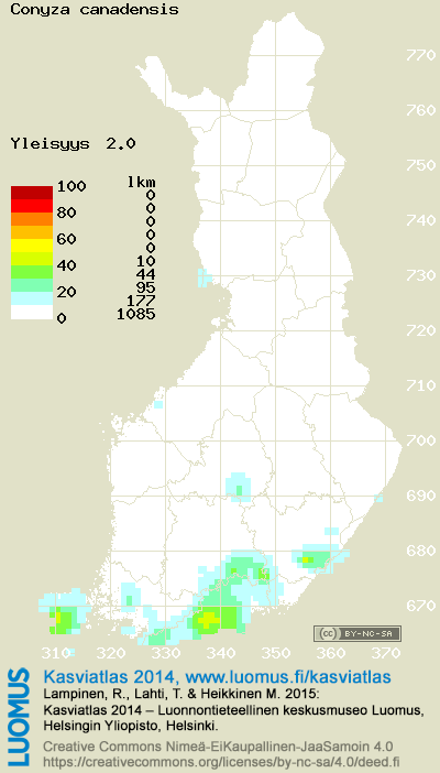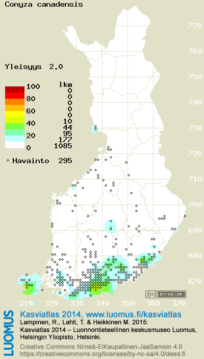 Tämä on vuoden 2014 kasviatlaksen karttasivu taksonista Conyza canadensis. Tästä taksonista voi olla karttoja myös muissa atlaksen vuosiversioissa: 2018 / 2017 / 2016 / 2015 / 2014 / 2013 / 2012 / 2011 / 2010 / 2009 / 2008 / 2007 / 2006.