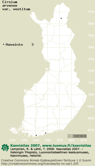 Tämä on vuoden 2006 kasviatlaksen karttasivu taksonista Cirsium arvense var. vestitum. Tästä taksonista voi olla karttoja myös muissa atlaksen vuosiversioissa: 2018 / 2017 / 2016 / 2015 / 2014 / 2013 / 2012 / 2011 / 2010 / 2009 / 2008 / 2007 / 2006.