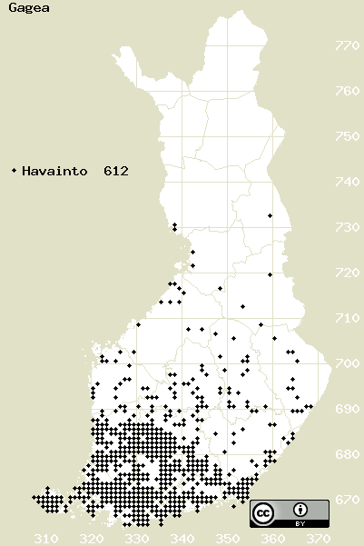 Tämä on vuoden 2017 kasviatlaksen karttasivu taksonista Gagea. Tästä taksonista voi olla karttoja myös muissa atlaksen vuosiversioissa: 2018 / 2017 / 2016 / 2015 / 2014 / 2013 / 2012 / 2011 / 2010 / 2009 / 2008 / 2007 / 2006.