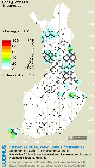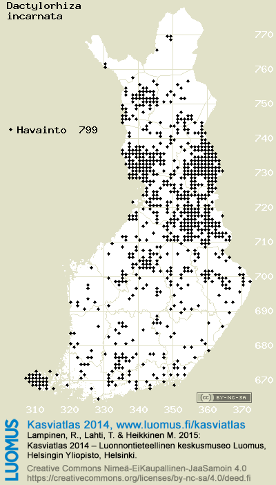 Tämä on vuoden 2014 kasviatlaksen karttasivu taksonista Dactylorhiza incarnata. Tästä taksonista voi olla karttoja myös muissa atlaksen vuosiversioissa: 2018 / 2017 / 2016 / 2015 / 2014 / 2013 / 2012 / 2011 / 2010 / 2009 / 2008 / 2007 / 2006.