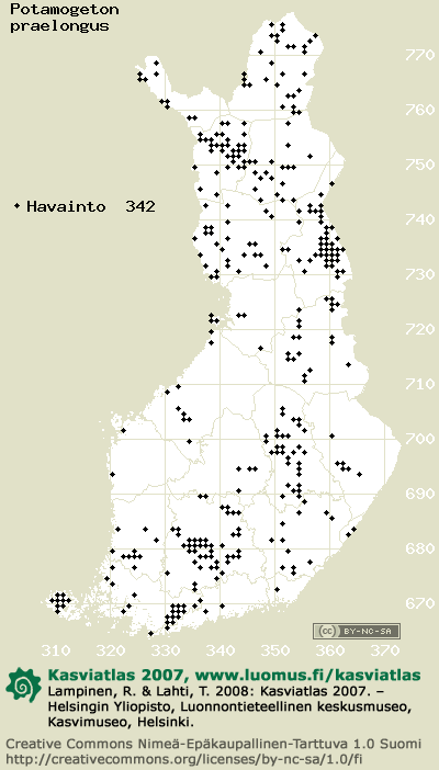 Tämä on vuoden 2006 kasviatlaksen karttasivu taksonista Potamogeton praelongus. Tästä taksonista voi olla karttoja myös muissa atlaksen vuosiversioissa: 2018 / 2017 / 2016 / 2015 / 2014 / 2013 / 2012 / 2011 / 2010 / 2009 / 2008 / 2007 / 2006.