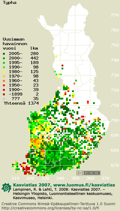 Tämä on vuoden 2006 kasviatlaksen karttasivu taksonista Typha. Tästä taksonista voi olla karttoja myös muissa atlaksen vuosiversioissa: 2018 / 2017 / 2016 / 2015 / 2014 / 2013 / 2012 / 2011 / 2010 / 2009 / 2008 / 2007 / 2006.