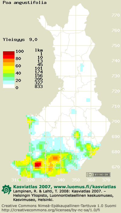 Tämä on vuoden 2006 kasviatlaksen karttasivu taksonista Poa angustifolia. Tästä taksonista voi olla karttoja myös muissa atlaksen vuosiversioissa: 2018 / 2017 / 2016 / 2015 / 2014 / 2013 / 2012 / 2011 / 2010 / 2009 / 2008 / 2007 / 2006.