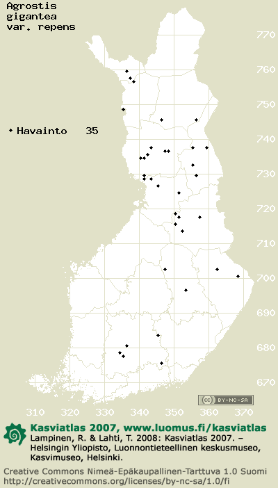 Tämä on vuoden 2006 kasviatlaksen karttasivu taksonista Agrostis gigantea var. repens. Tästä taksonista voi olla karttoja myös muissa atlaksen vuosiversioissa: 2018 / 2017 / 2016 / 2015 / 2014 / 2013 / 2012 / 2011 / 2010 / 2009 / 2008 / 2007 / 2006.