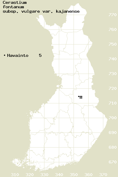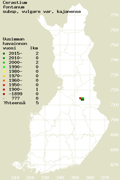 Tämä on jatkuvasti päivittyvä kasviatlaksen karttasivu taksonista Cerastium fontanum subsp. vulgare var. kajanense. Tästä taksonista voi olla karttoja eri vuosien atlaksissa: 2018 / 2017 / 2016 / 2015 / 2014 / 2013 / 2012 / 2011 / 2010 / 2009 / 2008 / 2007 / 2006.