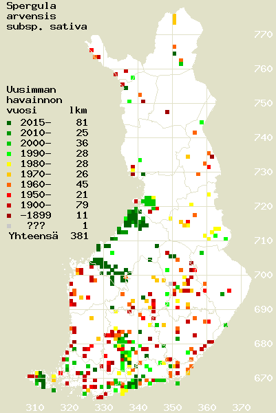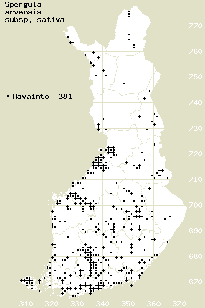 Tämä on jatkuvasti päivittyvä kasviatlaksen karttasivu taksonista Spergula arvensis subsp. sativa. Tästä taksonista voi olla karttoja eri vuosien atlaksissa: 2018 / 2017 / 2016 / 2015 / 2014 / 2013 / 2012 / 2011 / 2010 / 2009 / 2008 / 2007 / 2006.