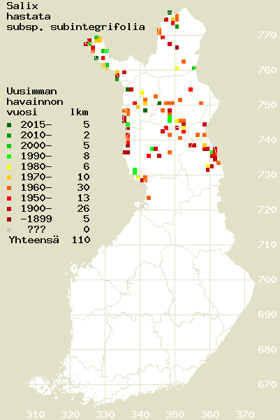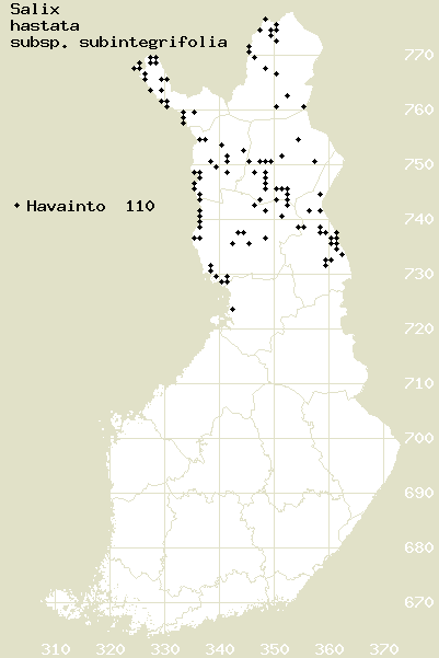 Tämä on jatkuvasti päivittyvä kasviatlaksen karttasivu taksonista Salix hastata subsp. subintegrifolia. Tästä taksonista voi olla karttoja eri vuosien atlaksissa: 2018 / 2017 / 2016 / 2015 / 2014 / 2013 / 2012 / 2011 / 2010 / 2009 / 2008 / 2007 / 2006.