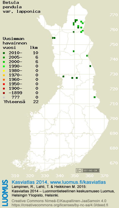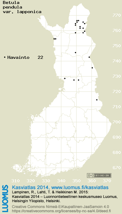 Tämä on vuoden 2014 kasviatlaksen karttasivu taksonista Betula pendula var. lapponica. Tästä taksonista voi olla karttoja myös muissa atlaksen vuosiversioissa: 2018 / 2017 / 2016 / 2015 / 2014 / 2013 / 2012 / 2011 / 2010 / 2009 / 2008 / 2007 / 2006.