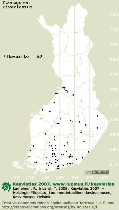 Tämä on vuoden 2006 kasviatlaksen karttasivu taksonista Aconogonon divaricatum. Tästä taksonista voi olla karttoja myös muissa atlaksen vuosiversioissa: 2018 / 2017 / 2016 / 2015 / 2014 / 2013 / 2012 / 2011 / 2010 / 2009 / 2008 / 2007 / 2006.