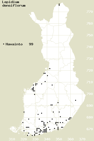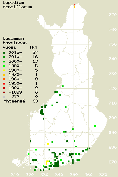 Tämä on jatkuvasti päivittyvä kasviatlaksen karttasivu taksonista Lepidium densiflorum. Tästä taksonista voi olla karttoja eri vuosien atlaksissa: 2018 / 2017 / 2016 / 2015 / 2014 / 2013 / 2012 / 2011 / 2010 / 2009 / 2008 / 2007 / 2006.