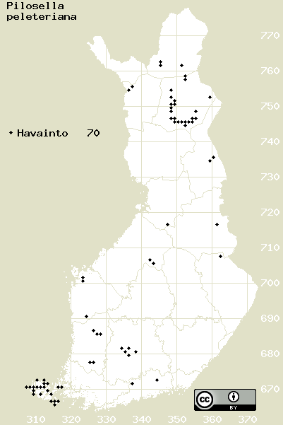 Tämä on vuoden 2017 kasviatlaksen karttasivu taksonista Pilosella peleteriana. Tästä taksonista voi olla karttoja myös muissa atlaksen vuosiversioissa: 2018 / 2017 / 2016 / 2015 / 2014 / 2013 / 2012 / 2011 / 2010 / 2009 / 2008 / 2007 / 2006.