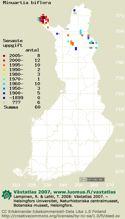 Detta är årets 2007 kartsida över taxonet Minuartia biflora. Över taxonet kan finnas kartor även från andra år: 2018 / 2017 / 2016 / 2015 / 2014 / 2013 / 2012 / 2011 / 2010 / 2009 / 2008 / 2007 / 2006.