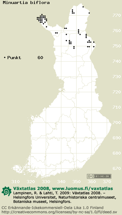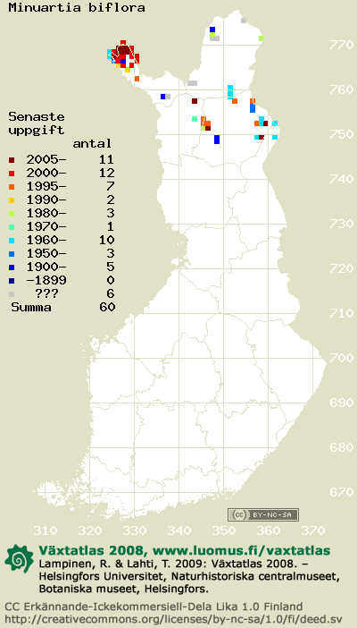 Detta är årets 2008 kartsida över taxonet Minuartia biflora. Över taxonet kan finnas kartor även från andra år: 2018 / 2017 / 2016 / 2015 / 2014 / 2013 / 2012 / 2011 / 2010 / 2009 / 2008 / 2007 / 2006.