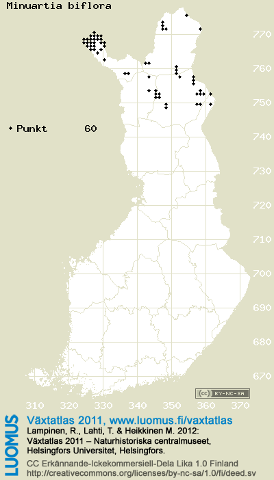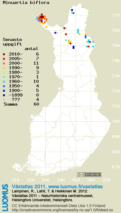 Detta är årets 2011 kartsida över taxonet Minuartia biflora. Över taxonet kan finnas kartor även från andra år: 2018 / 2017 / 2016 / 2015 / 2014 / 2013 / 2012 / 2011 / 2010 / 2009 / 2008 / 2007 / 2006.