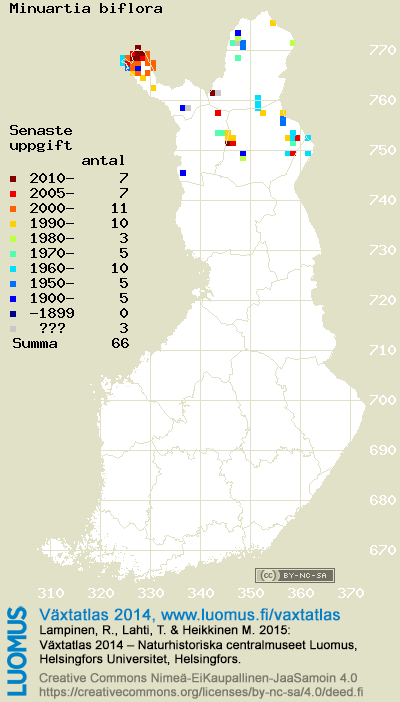 Detta är årets 2014 kartsida över taxonet Minuartia biflora. Över taxonet kan finnas kartor även från andra år: 2018 / 2017 / 2016 / 2015 / 2014 / 2013 / 2012 / 2011 / 2010 / 2009 / 2008 / 2007 / 2006.