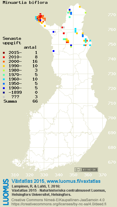 Detta är årets 2015 kartsida över taxonet Minuartia biflora. Över taxonet kan finnas kartor även från andra år: 2018 / 2017 / 2016 / 2015 / 2014 / 2013 / 2012 / 2011 / 2010 / 2009 / 2008 / 2007 / 2006.