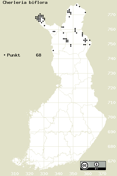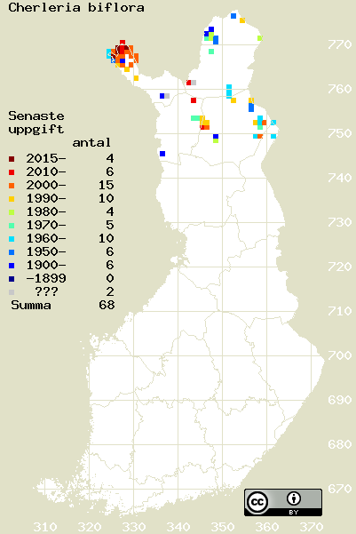 Detta är årets 2018 kartsida över taxonet Cherleria biflora. Över taxonet kan finnas kartor även från andra år: 2018 / 2017 / 2016 / 2015 / 2014 / 2013 / 2012 / 2011 / 2010 / 2009 / 2008 / 2007 / 2006.