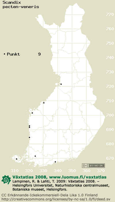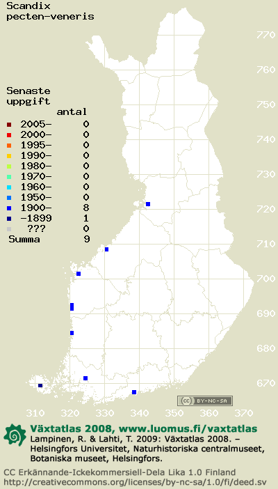 Detta är årets 2008 kartsida över taxonet Scandix pecten-veneris. Över taxonet kan finnas kartor även från andra år: 2018 / 2017 / 2016 / 2015 / 2014 / 2013 / 2012 / 2011 / 2010 / 2009 / 2008 / 2007 / 2006.